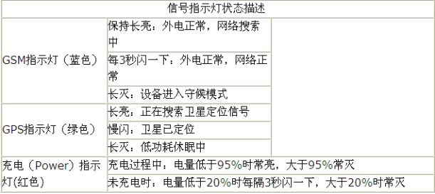 GPS定位設備有藍色、綠色、紅色三個指示燈。當綠燈由長亮變成慢閃則表示衛(wèi)星定位已進入正常工作狀態(tài),當藍燈由長亮變成每3秒閃爍一下,則表示GSM工作正常。